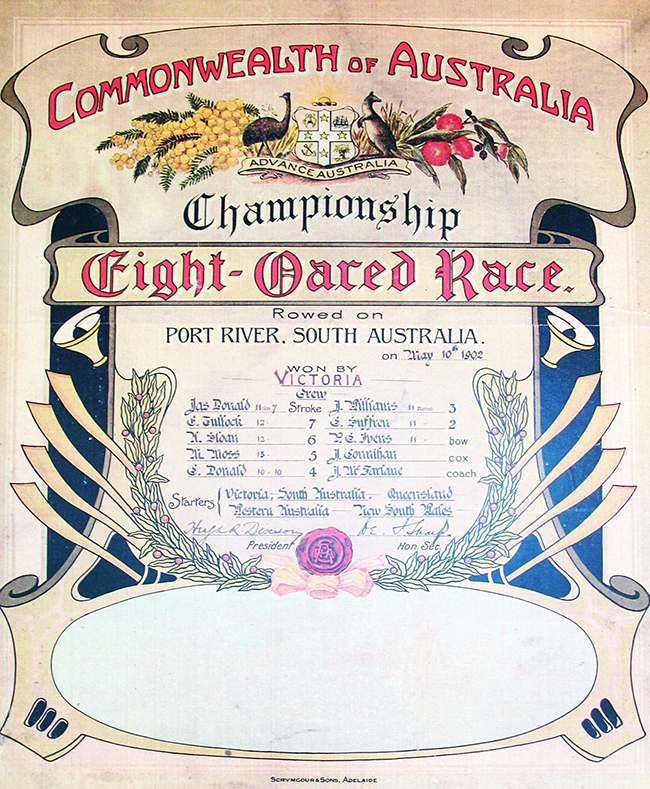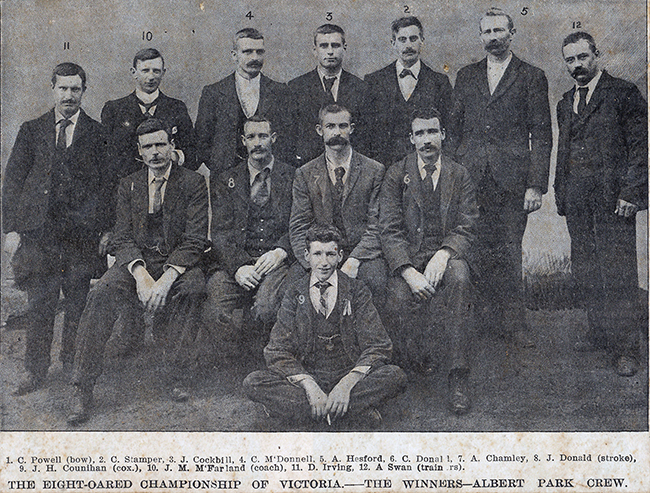 Another good years for Victoria with a fine win in the eight oared championships of Australia. The crew comprised: Bow: Percy C Ivens, 2: J A Williams, 3: John Cockbill, 4: James Donald, 5: Alex Chamley, 6: William Potter, 7: Jack Southern, Str: Alex B Sloan, Cox: Lisle Jones, Cch: Jim M Macfarlane. No sculling representative was sent.