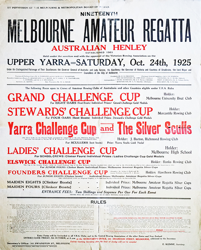 The Grand Challenge Cup was returned to a Melbourne club with Hawthorn RC taking victory for the first time. The Ladies’ Challenge Cup suffered from a lack of entries, with a straight final determining Melbourne High School as victors.