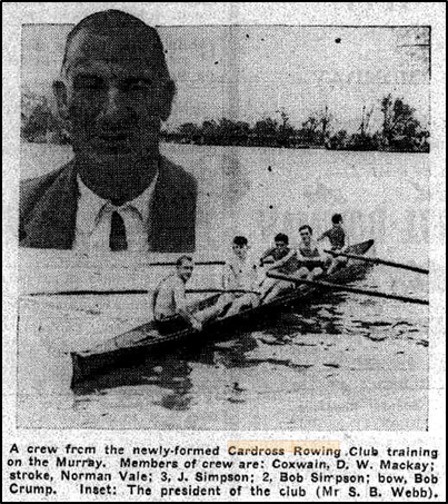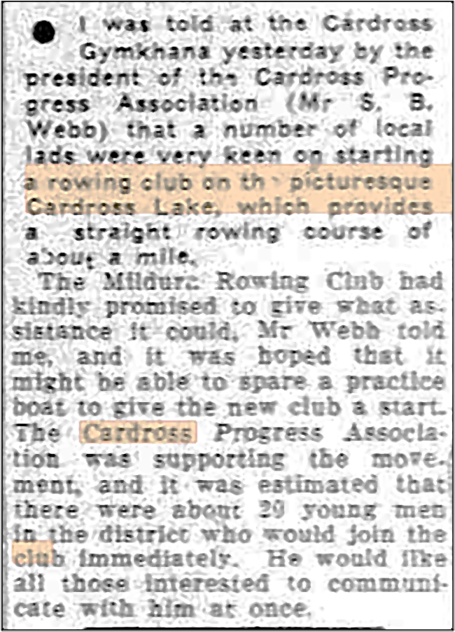 It was announced in January 28, 1947 according to the report in the Sunraysia Daily, that a rowing club was to be formed at Cardross. The Cardross Progress Association, which had developed and had control of the picturesque Cardross Lake was supporting the move . The President of that Association, Mr. Syd B. Webb, mentioned that there were about 20 young men who were keen to start a rowing club.