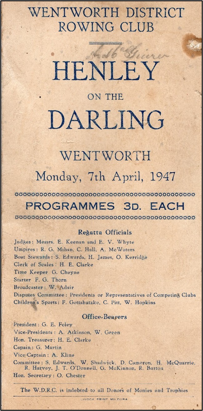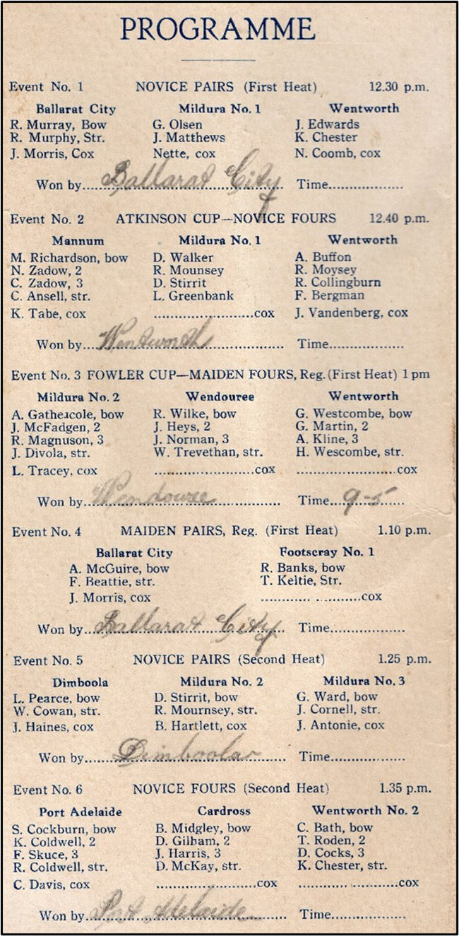 The crew of Bruce Midgley (bow), D. Gilham (2), Jack Harris (3) and Don Mackay (stroke) finished third in their heat behind Wentworth and Mildura. Wentworth went on to finish second in the final to Port Adelaide Rowing Club in the final.