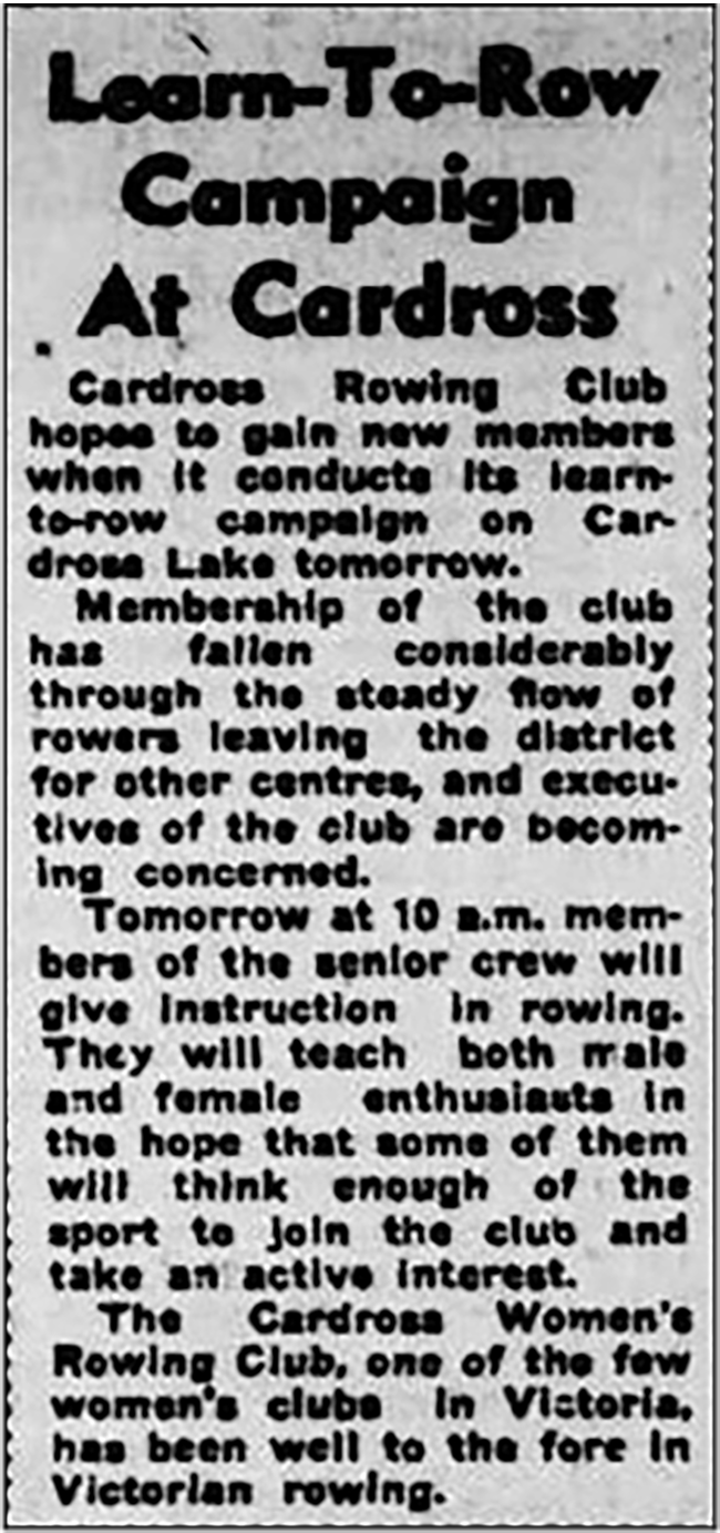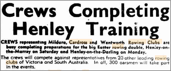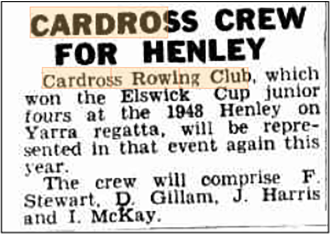 By March 1951 Cardross crews were reported to be training for the Easter double of Henley on the Murray and Henley on the Darling. Cardross entered a Junior pair at the Mildura regatta that placed second to Mildura rowing club in the final.