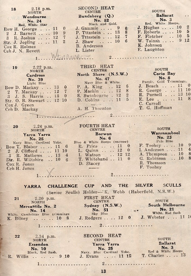It was also reported in the Weekly Times (29 November) that at this particular regatta there were three dead heats called by the judges! Given the high number of dead heats and close finishes perhaps the eyesight of the line judge should have been called into question!
