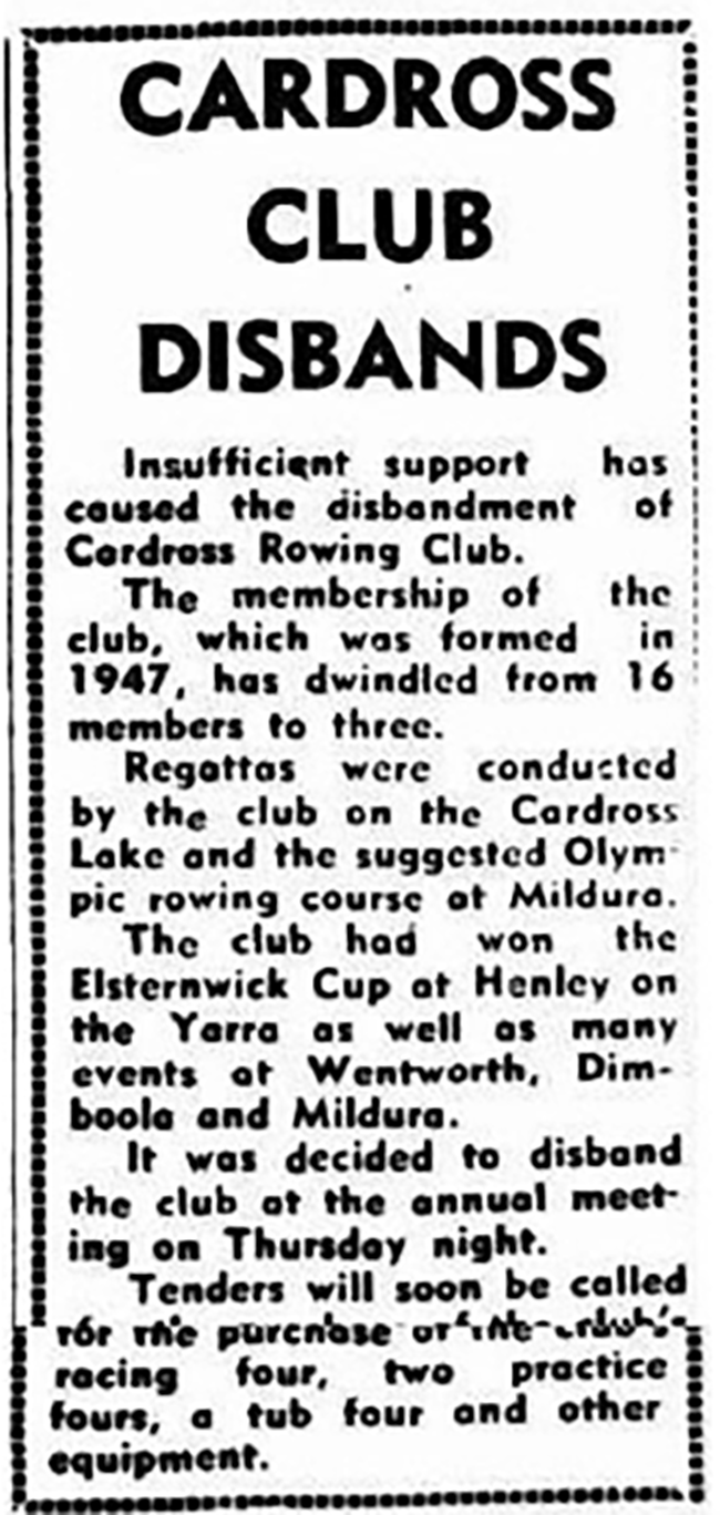The club had had a brief existence but made an impact on Victorian rowing. Most of their racing was at local Victorian regattas Mildura, Wentworth and Dimboola as well as South Australian Regattas at Berri and Renmark. They made the long trek to Melbourne to the VRA regatta usually held a week before Henley on Yarra. They were only a small club but all their crews put in great performances at every regatta they attended.
