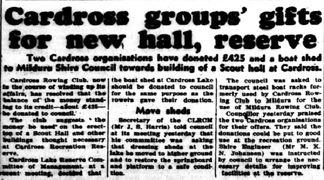 The club donated 425 pounds and the boatshed they had built on the edge of the lake to the Mildura Shire Council towards building a Scout Hall in Cardross and any other buildings thought necessary at the Cardross Recreation Reserve. The steel racks used by Cardross to store their boats were sent to Mildura for the use of Mildura Rowing Club.