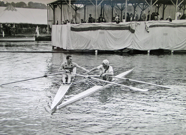 Before long we had the opportunity of trying out our new style at the Marlow Regatta (ten days before Henley). In the first heat we were drawn against Laurie and Wilson of Leander who were the nominated British Olympic pair and later winners of the Olympic gold medal. We got away very smartly rating well over forty strokes to the minute and did not drop below about thirty eight. We won the race by over two lengths. Later we won the final against Thames Rowing Club by three and a half lengths. At the Henley Regatta we won our first two races "easily" and joined Laurie and Wilson in the final.