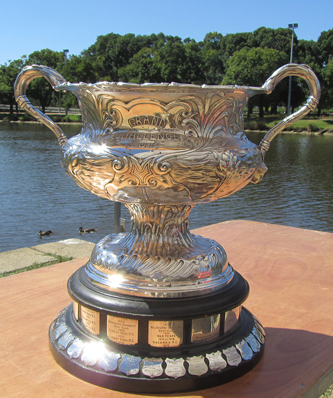 Within the front cartouche is an embossed inscription - "GRAND CHALLENGE CUP" and in the rear cartouche is embossed the Melbourne Amateur Regatta emblem.