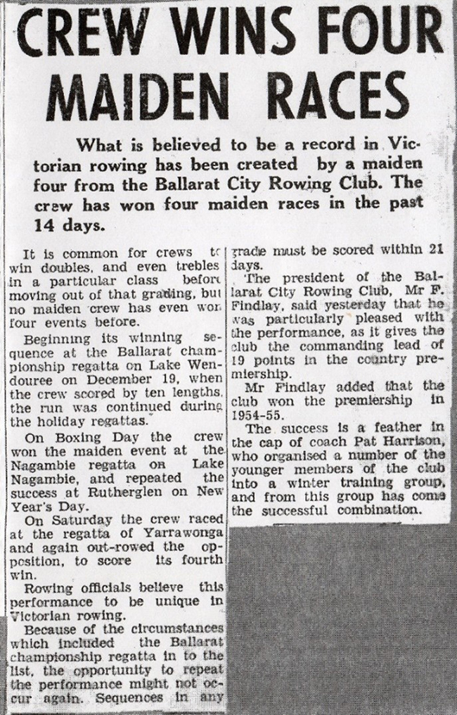 1960-61, the same crew won four Junior fours in succession at Footscray Regatta, Scotch Mercantile Regatta, Ballarat and Albert Park Regatta. They also were the first crew across the line in the Victorian Sprint Four Championship at Dimboola in 1960 but were disqualified over a clash of oars as they crossed the line.