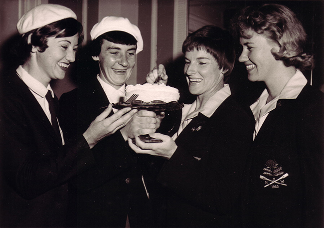 Members of the 1960 Victorian and NSW crews being tempted by cream cake - Susan on the right hand side