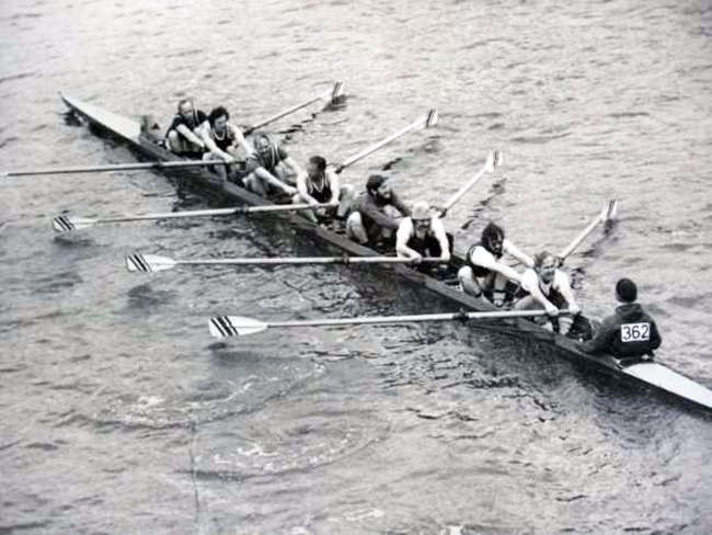 Ralph at bow. Johnny Enright at stroke with Ted Rotherham at 2 plus Graham Fitch, John Hart, Mick Williamson, Chalky White with Pauline Churcher Coxing
