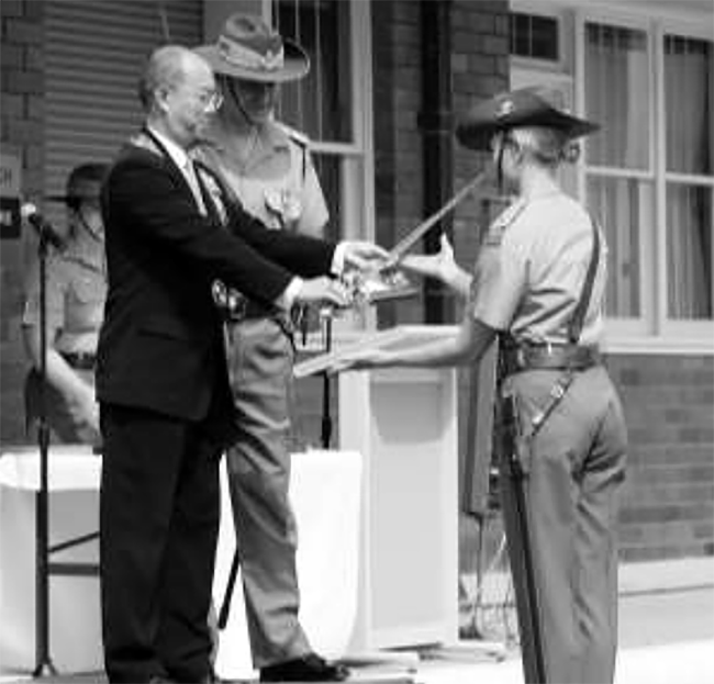 2Lt (formerly UO) K.J. Andrews (right) receiving the Lt T.N.H. Stretch, MC and Bar Sword of Honour from the Mayor of the City of Randwick, Cr T. Seng together with an accompanying book prize from the UNSWR Commanding Officer, Lt Col M.J. Abrahams, UNSWR Depot, Kensington, 5th March 2006. (Randwick City Council)