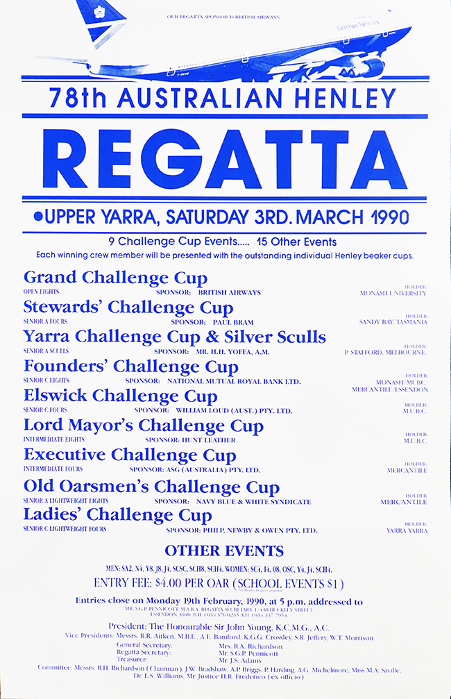 At the local level, recognition was extended to the Melbourne Amateur Regatta Association for organizing five international crews, contributing to the success of the Grand Challenge Cup at the Australia Henley Regatta. The vision of this organising committee was ‘to give Victorian and Australian rowing a boost by inviting international crews to compete at Australian Henley’. The costs were significant; nearly $60,000 was donated to the British, German and American clubs competing for travel costs. The restoration of this regatta was near complete.