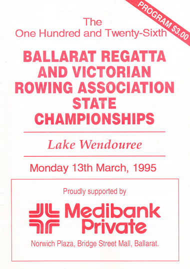 The Victorian Championships regatta was conducted on Lake Wendouree on Monday 13th March 1995. The very full program started at 7.45am in the morning and finished at 6.50pm with 130 races on 5 minute intervals.