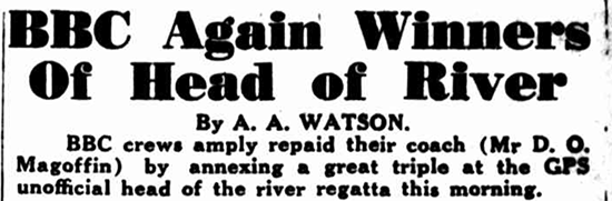 "A pleasant innovation to the usual "Head of the River" programme this year was a broadcast descripion of the race on short and long wave by the A.B.C. The broadcast was made by Mr. J. J. Delahunty, Chairman of the Queensland Rowing Council, and by this means old boys on service at home and abroad were given the oppurtunity of hearing the description of the Big Race, which must have been a sure reminder of many happy memories."