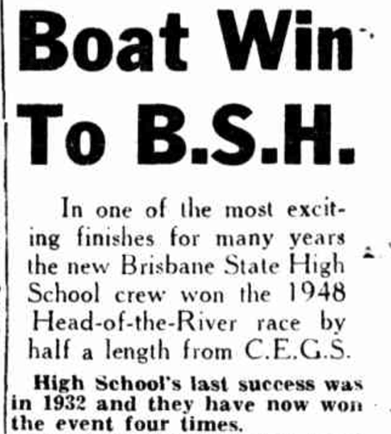Brisbane State High School beat the experts yesterday by winning the Head of the River in magnificient style. The outsiders led right from the start and never really looked like losing. Conditions were bad. Crews drawing centre positions had to battle a strong current; time was the worst ever - 5 mins 32 secs"Page 12, Truth, 18 April 1948 Edition