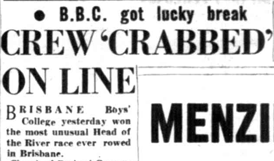 “Brisbane Boys’ College yesterday won the most unusual Head of the River race ever rowed in Brisbane… Church of England Grammar School had the race almost won when they “crabbed” on the line…. In such calm conditions, a crab could only be regarded as bad rowing. The one error cost the crew the race.”