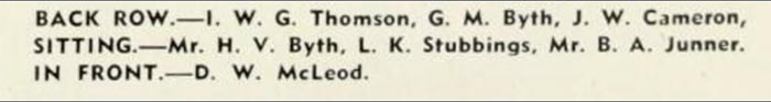 1st Brisbane Boys’ College - Bow: I. W. G. Thompson, 2: J. W. Cameron, 3: G. M. Byth, Str: L. K. Stubbings, Coach: B. A. Junner