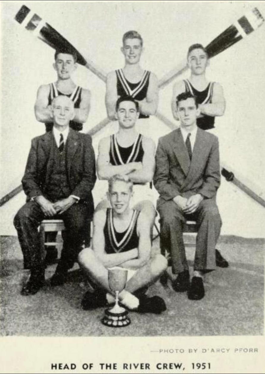 “With victory two strokes away, Church of England Grammar School lost the 1951 Head of the River race in one of the most sensational regattas ever seen in Brisbane. From the start a battle developed between C.E.G.S, Brisbane Boys’ College and the Southport School. At the finish C.E.G.S were giving a last fighting dozen which should have won them the race. Their supporters were cheering the victory when suddenly the crew caught a tremendous “crab”. The shell lurched heavily and stopped running it own length. In a matter of seconds, B.B.C, Southport, State High and Brisbane Grammar flashed by to claim the positions in that order…. The Performance of the C.E.G.S. crew was all the more remarkable when it is considered that they had been only the school’s second crew. In a race eve challenge race they downed the school’s first crew, and the crews changed races. ”