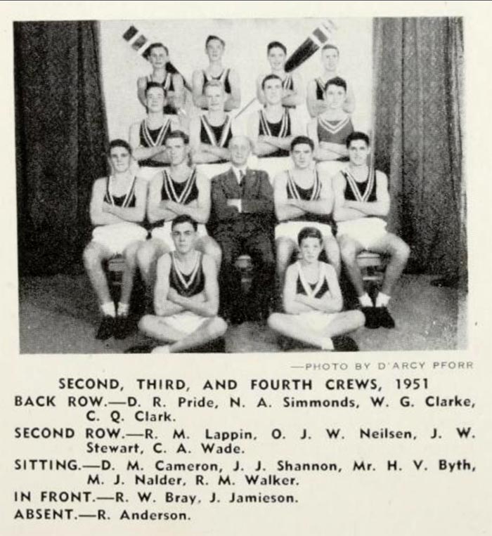 1st Brisbane Boys’ College IV - Bow: C. Q. Clarke, 2: W. G. Clarke, 3: N. A. Simmonds, Str: D. R. Pride, Cox: J. Jamieson, Coach: Mr. J. A. Cameron
