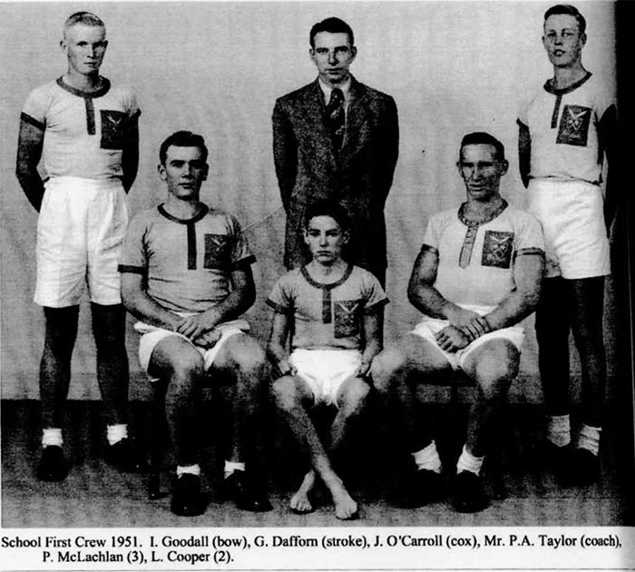 5th Church of England Grammar School - Bow: I. Goodall, 2: L. Cooper, 3: P. McLachlan, Str: G. Dafforn, Coach: P. A. Taylor
