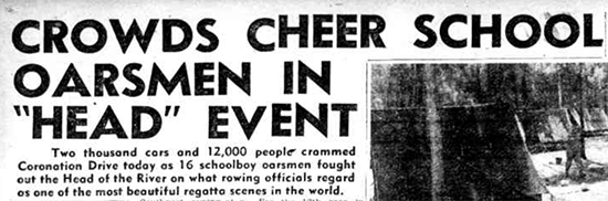 According to the Brisbane Telegraph, 12 000 people and 2 000 cars packed the banks of the Milton Reach creating a brilliant spectacle, witnessing the Southport School unwind a great sustained finishing burst to beat the favoured crews.