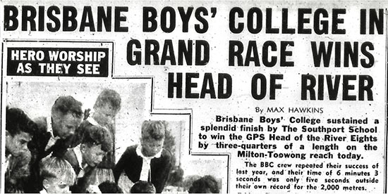 "A big crowd watched the finish of the 1957 GPS Head of the River as the Brisbane Boys' College crew wins by three-quarters of a length from Southport, Grammar was in third place." Page 24, Brisbane Telegraph, Saturday April 6th 1957 Edition