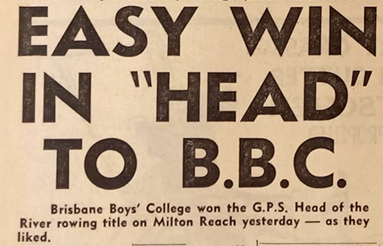 David Magoffin’s pick for the winner of the [Head of the River]? “B.B.C.” he says. Favourites for the race are B.B.C., “Churchie” and Grammar on an equal footing. And an outside bet? State High report that they have had some very fast trials over the course. The 2000 metres “Head” race starts at 3.45 p.m., a short distance upstream from the William Jolly Bridge and will finish at the Toowong boat shed opposite the Regatta Hotel.”