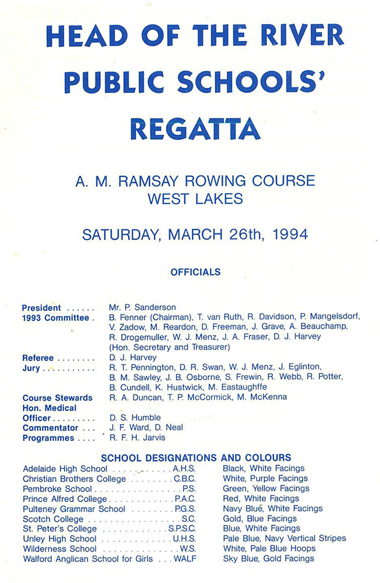 The 1994 regatta was conducted on 26th March 1994on the A M Ramsey Rowing course at West lakes as usual with St Peter's College taking out the boy's Head of the River in record time with Walford doing the same in the girl's event. It was the fourth win in a row for Walford.