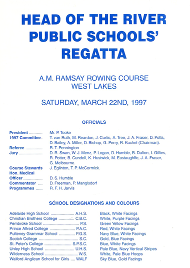 The 1997 Head of the River was conducted on 22nd March 1997 with Walford regaining the ascendancy in the girl's Head of the River and St Peter's College winning the boy's race for the second year in succession.