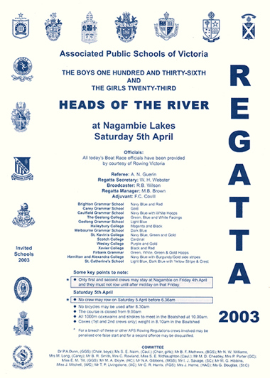 Committee: Dr P A Dunn (GGS - Chair of the Boys), Ms S E Nairn (Caulf - Chair of the Girls), Mr B F Mathews (BGS), Mr N W Williams, Mrs M Lomg (Carey), Mr B R Smith, Mrs C Rowland, Miss S E McNaughton (Caulf), Mr M D Cheatley, Mrs P Porter (GC), Miss E M Till (GGS), Mr M A Doyle (HC), Mr N A Gibbons (MGS), Mr I J Savage (SC), Mr M G Hibbins, Miss J Mitchell (WC), Mr T P Livingstone (XC), Mr C R Harris (FGS), Mrs J Horne (HAC), Ms G Douglas (StC)