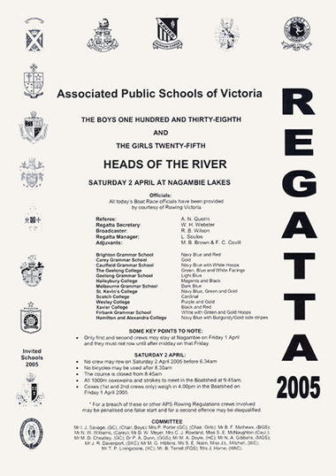 5th Wesley College: Bow: Rama Agung, 2: Michael Mellington, 3: Peter Mason, 4: Kyle Briede, 5: Redmond Stevenson, 6: Chris Bulled, 7: Bede Mayfield, Str: Jeremy Hetzel, Cox: Miles Munn, Coach: Ben Sandow