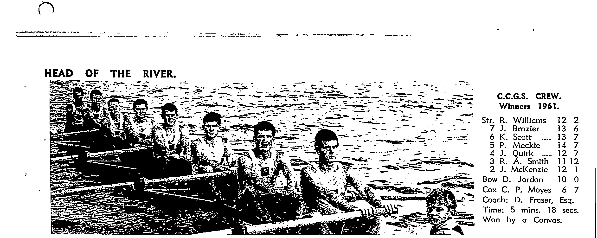 1st Christ Church Grammar School - Bow: D Jordan, 2: J McKenzie, 3: RAC Smith, 4: J Quirk, 5: P Mackie, 6: K Scott, 7: J Brazier, Str: R Williams, Cox: CP Moyes, Cch: D Frazer