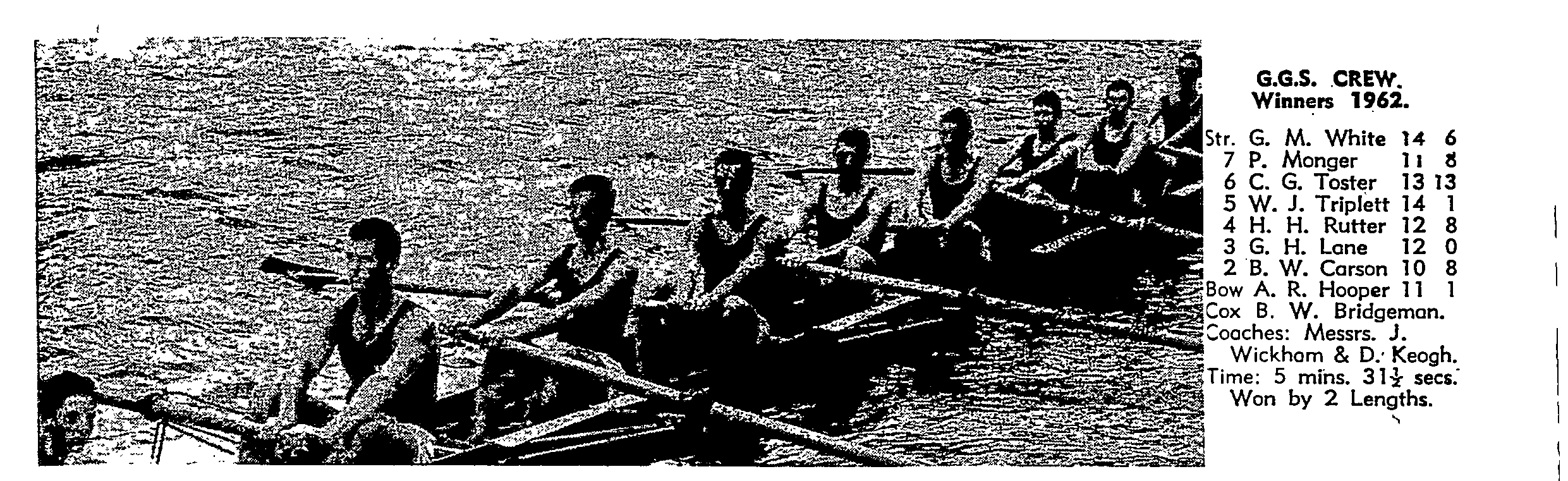 = 2nd Guildford Grammar School - Bow: K Copping, 2: SH Holthouse, 3: J Blackbourne, 4: CG Henn, 5: JA Wickham, 6: EA Avery, 7: R Moffat, Str: G Hale, Cox: K Copping
