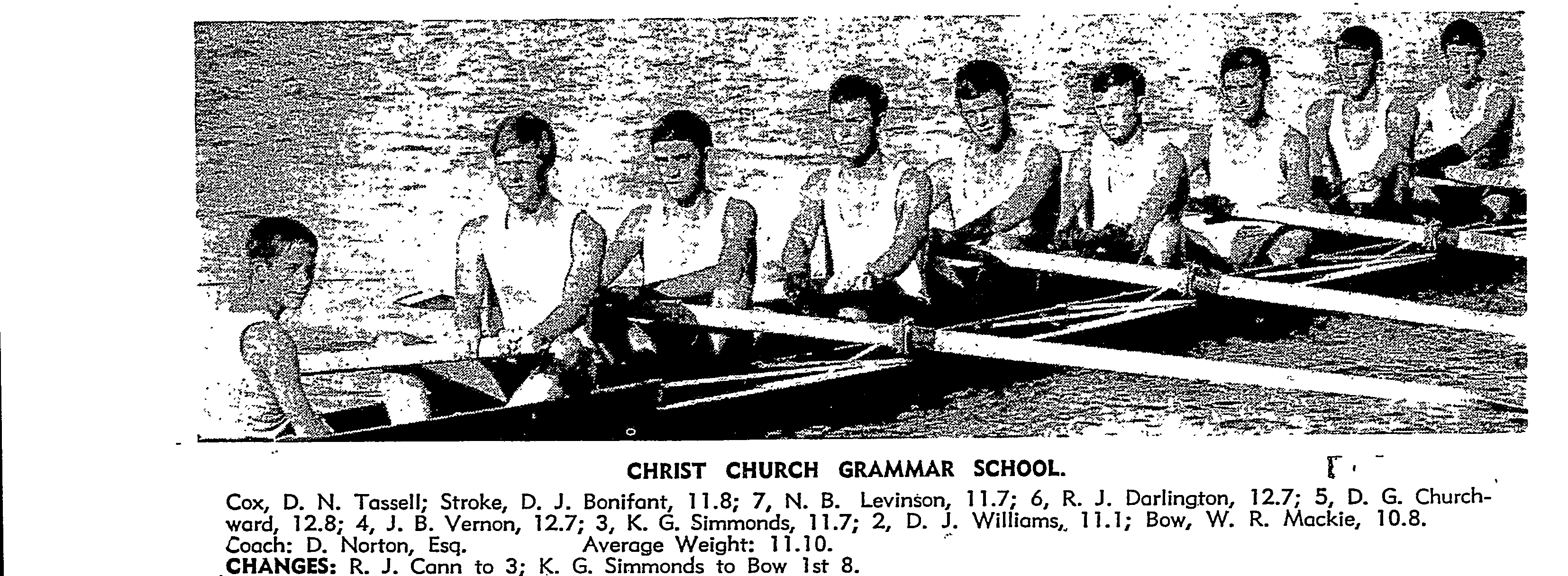 1st Christ Church Grammar School - Bow: WR Mackie, 2: DJ Williams, 3: RG Cann, 4: JB Vernon, 5: DG Churchward, 6: RJ Darlington, 7: NB Levinson, Str: DJ Bonifant, Cox: DN Tassell, Cch: D Norton