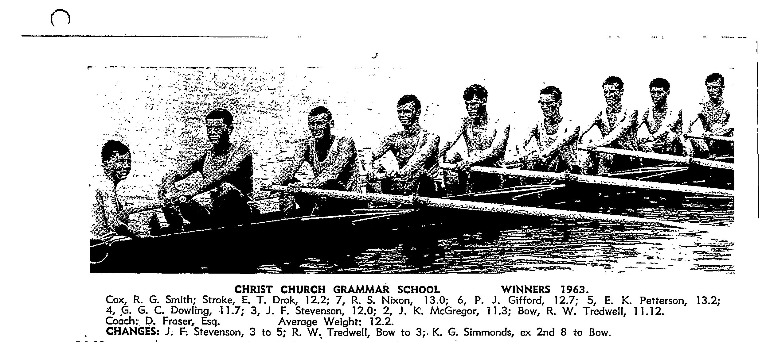 1st Christ Church Grammar School - Bow: KJ Simmonds, 2: JK McGregor, 3: RW Tredwell, 4: GGC Dowling, 5: JF Stevenson, 6: PJ Gifford, 7: RS Nixon, Str: ET Drok, Cox: RG Smith, Cch: D Fraser